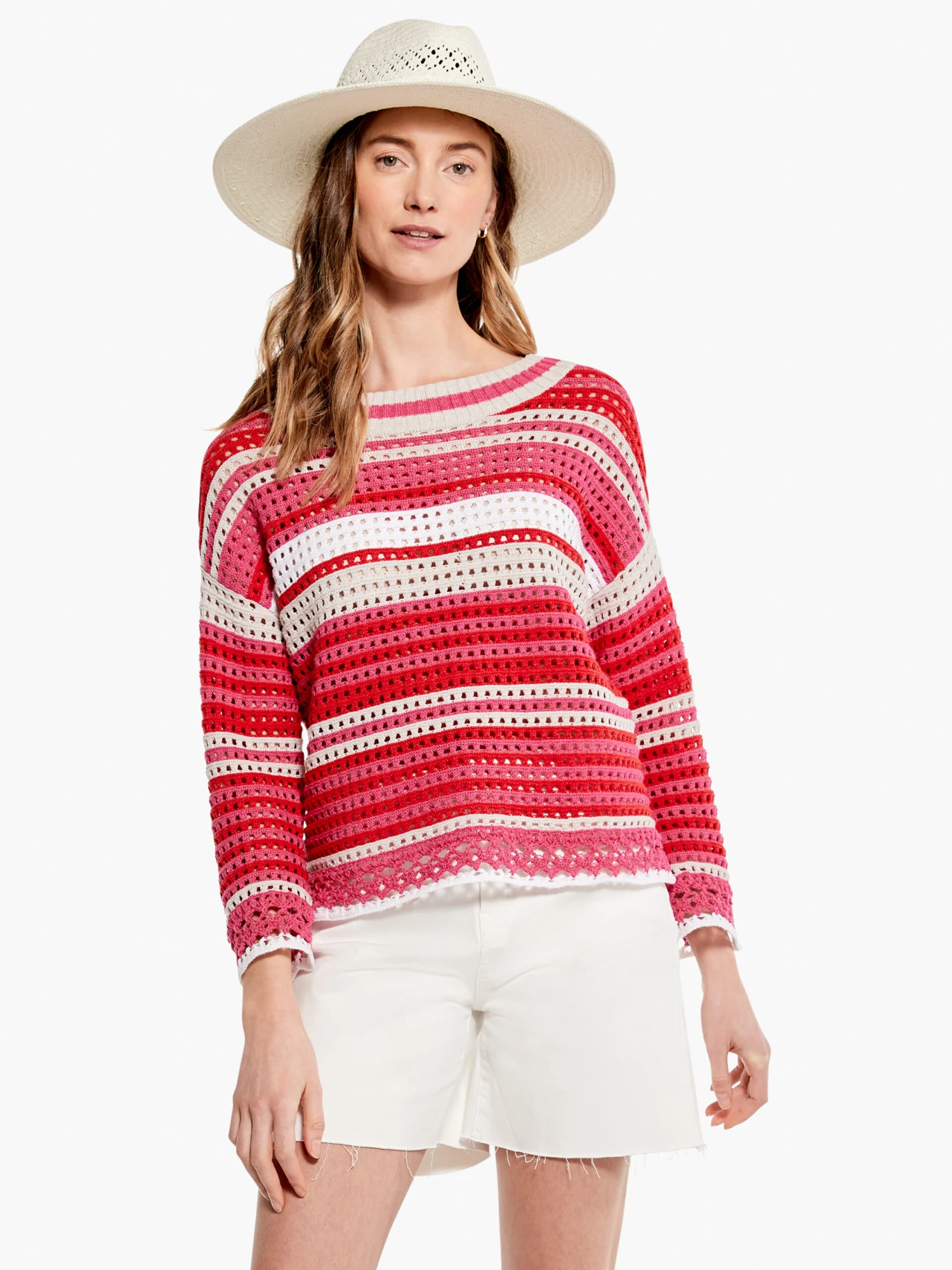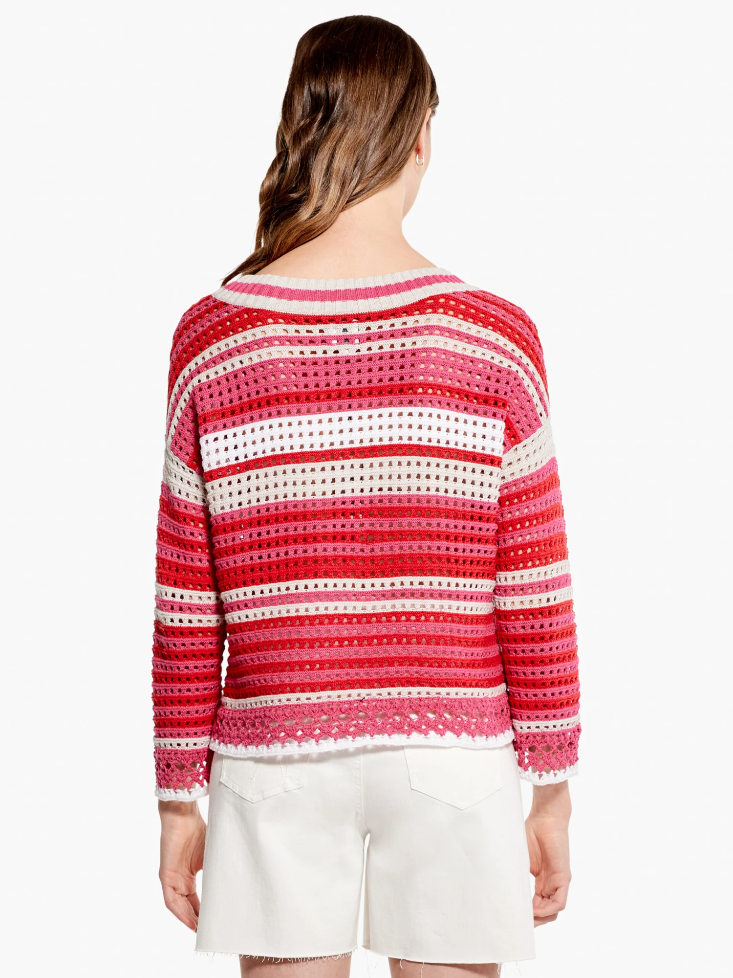 Give your next colorful burst of knit a handmade feel with this gorgeous faux-crochet (fauxchet?) piece. A lightweight, 3/4 sleeve pullover with a dropped shoulder silhouette designed to sit at the hip. We recommend wearing a light layer underneath for full coverage. Mindfully Made from responsibly sourced cotton and partially recycled material.