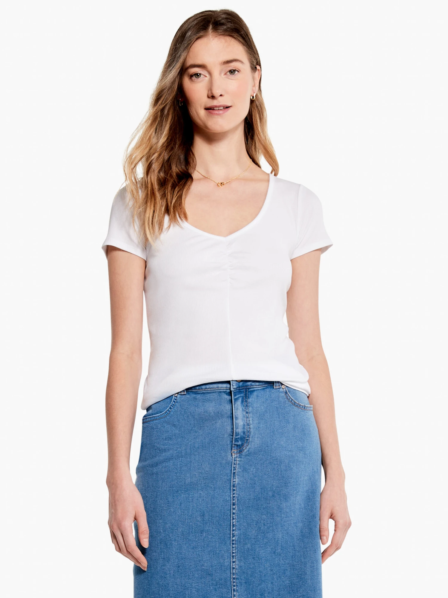 Made from our unique drapey rib fabric, this easy yet polished T-shirt makes every outfit, even your everyday denim pairing, feel like your most intentional look. The feminine detail at the chest elevates your style. With a generous V-neck opening and a more fitted silhouette with a basic short sleeve and a hem that sits at the hip.