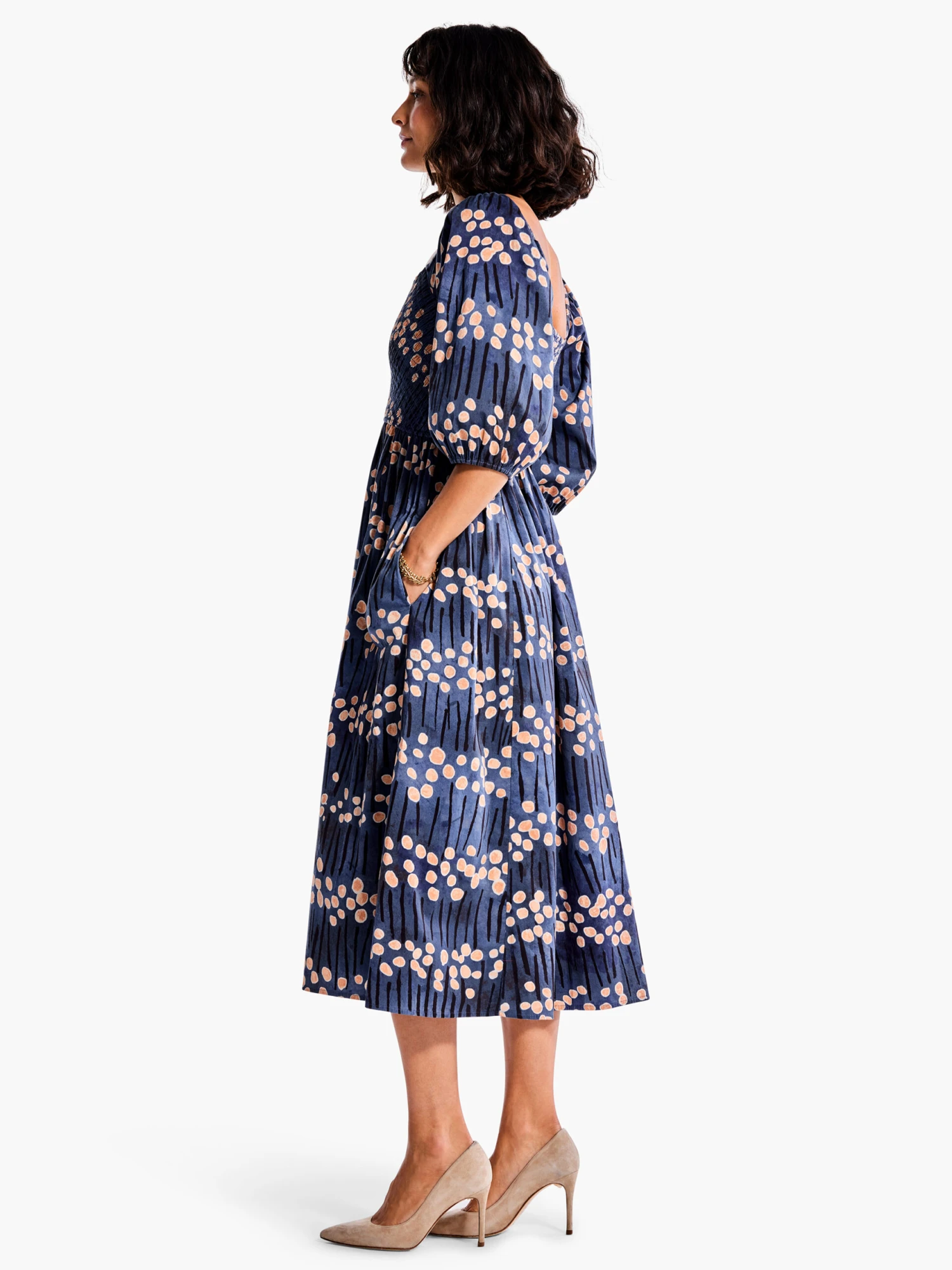 Inspired by the transition between summer and fall and day and night, the Firefly Glow Dress is set for anywhere and anytime thanks to its complementary colors and timeless, very fun shape. Designed for a fitted top half before flaring into a spin-ready bottom. We love the flounce elbow sleeves, side seams, and the elastic on the back. Falls below the knee.