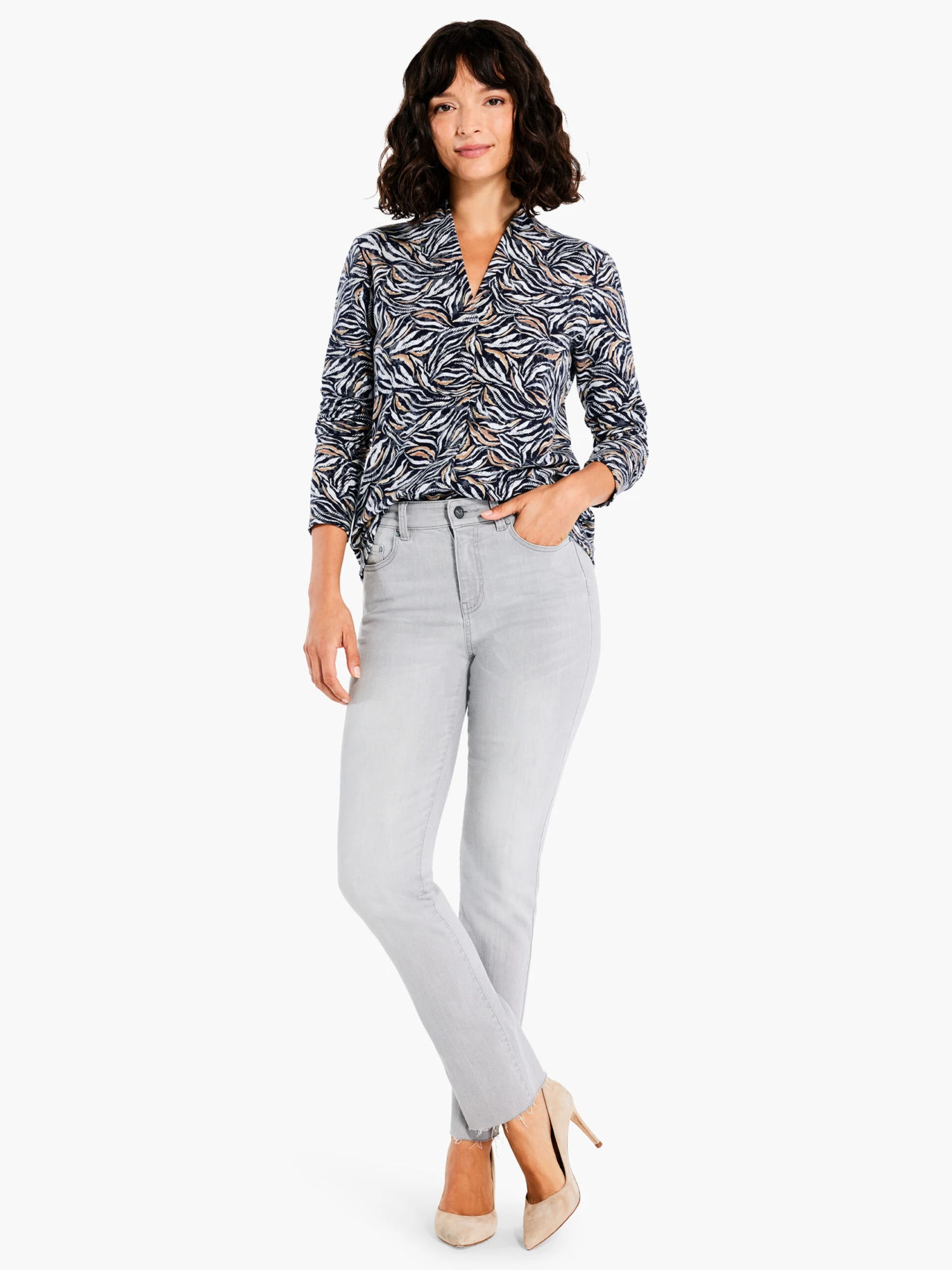 The fun of a natural print meets the sophistication and four-season versatility of elevated neutral tones. Made on a fabulously comfortable new cotton span French terry construction that you’ll reach for first. Midweight and with a regular fitting long-sleeved silhouette and a distinctive V-neck to add more shape. The hem sits at the hip.