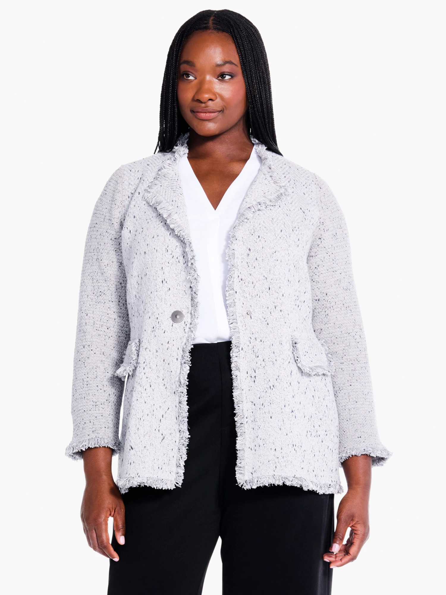 You can never have enough Fringe Mix. Introducing our ICO(NIC) Fringe Mix Blazer, a twist on the jacket, now with a longer hem and a couple of other key twists like the lack of buttons on the sleeves and the flat pockets. What’s stayed the same is what makes it great: the namesake fringe, and the knit sleeves/woven front still features, making this the comfiest jacket in your closet.