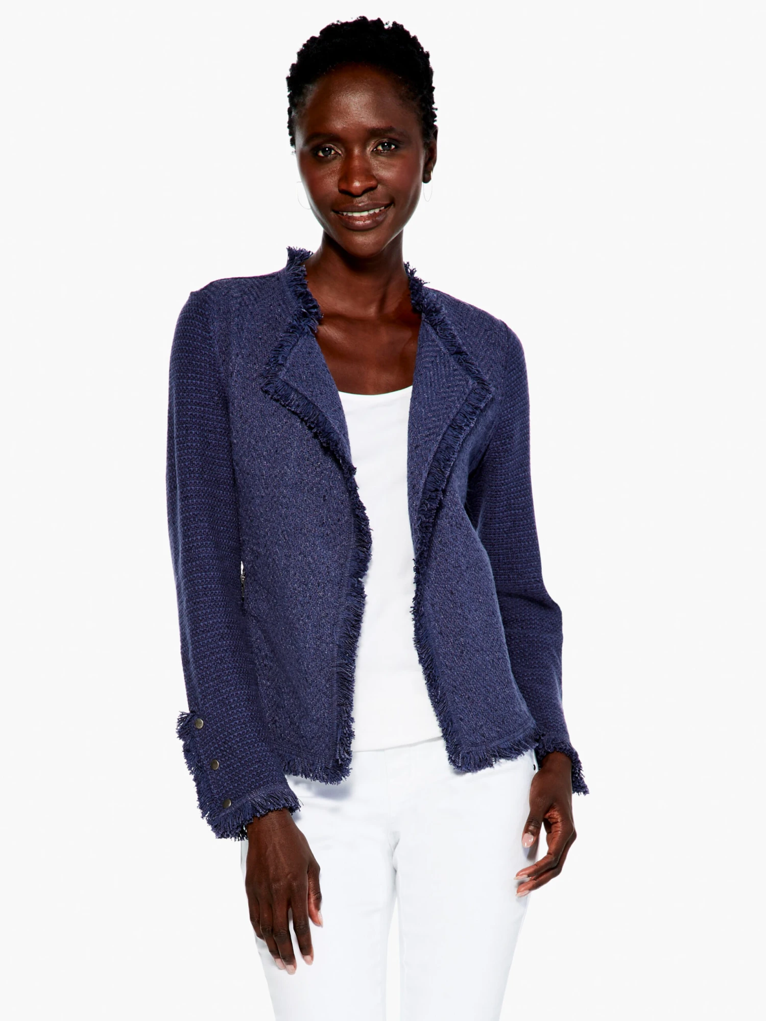 Happiness in jacket form, the Fringe Mix is an ICO(NIC) style: a tentpole style and bestseller, season after season. The classic silhouette with a twist adds fun to the workplace or just your everyday. We’ve added thoughtful details like the snap cuffs and the namesake fringe hem. An open front makes it easy to throw on and take off over the course of your day. A wearable pick-me-up.