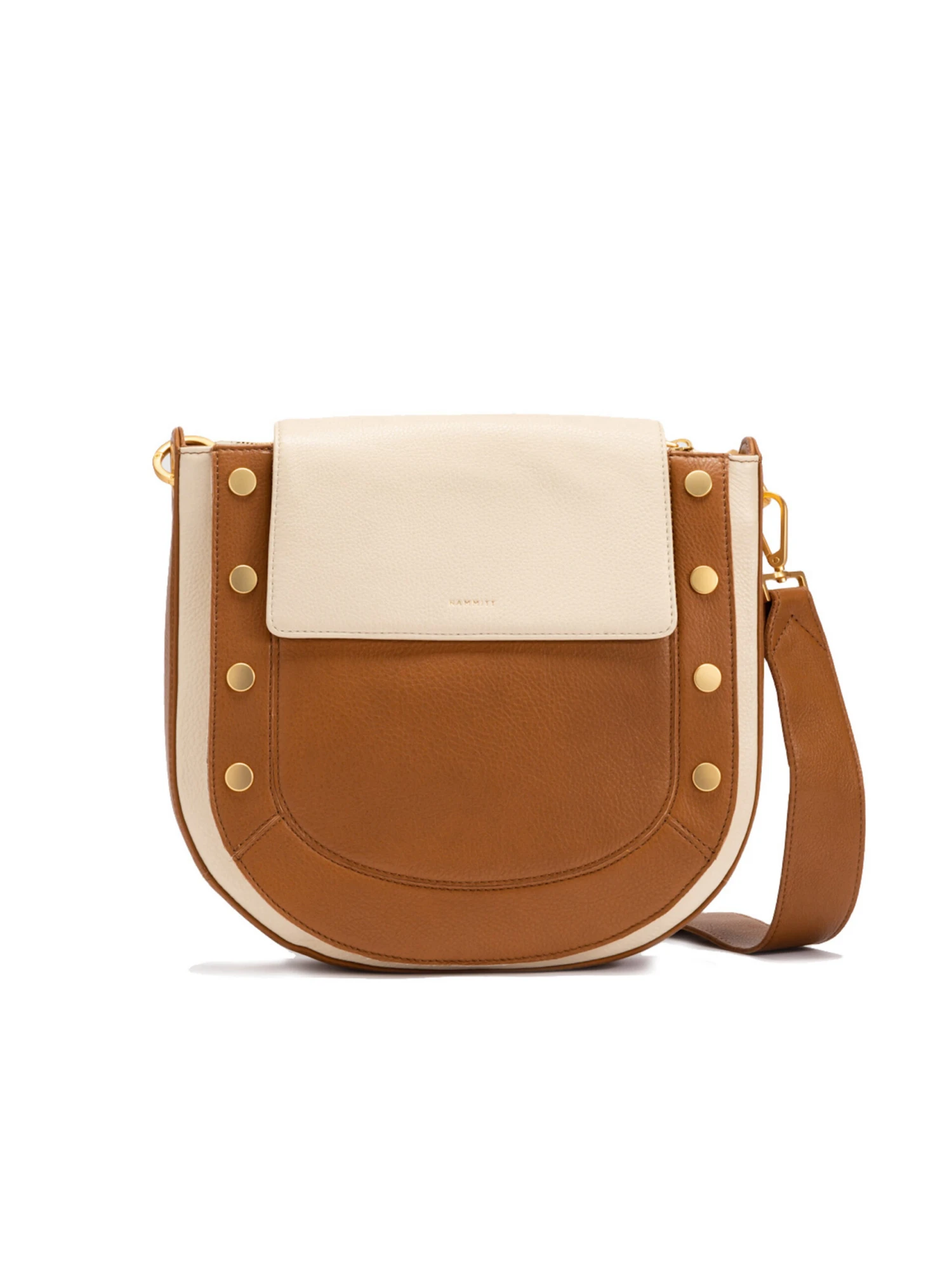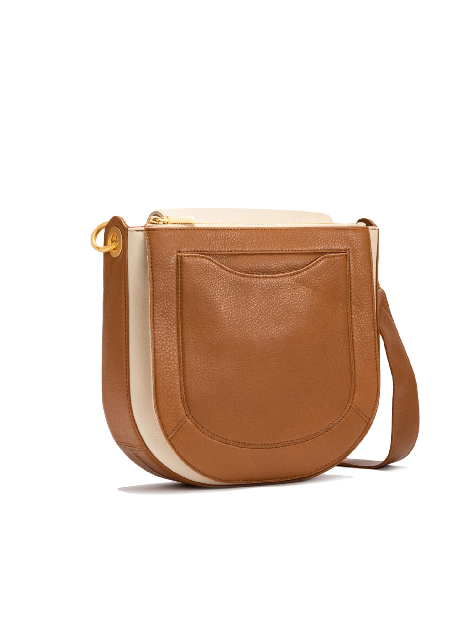 - Pebbled leather in medium brown and off-white hues. Brushed gold Hardware. Cotton Twill Lining