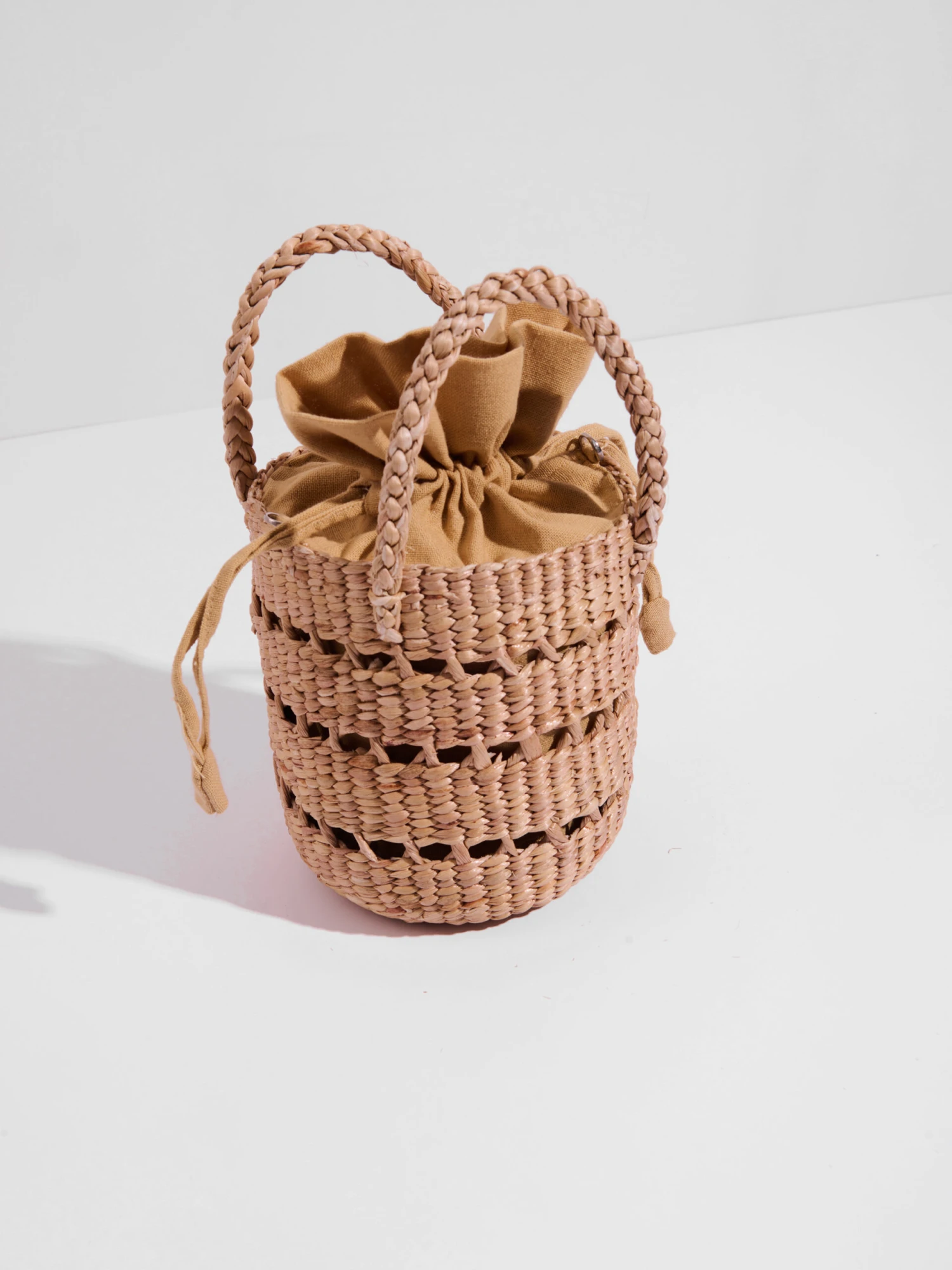 A simple open weave bag with fabric liner that’s functional and stylish with braided handles and drawstring detail! Mina is small, yet functional