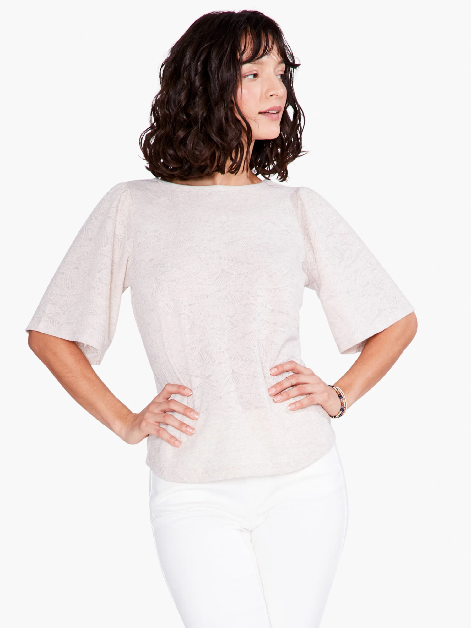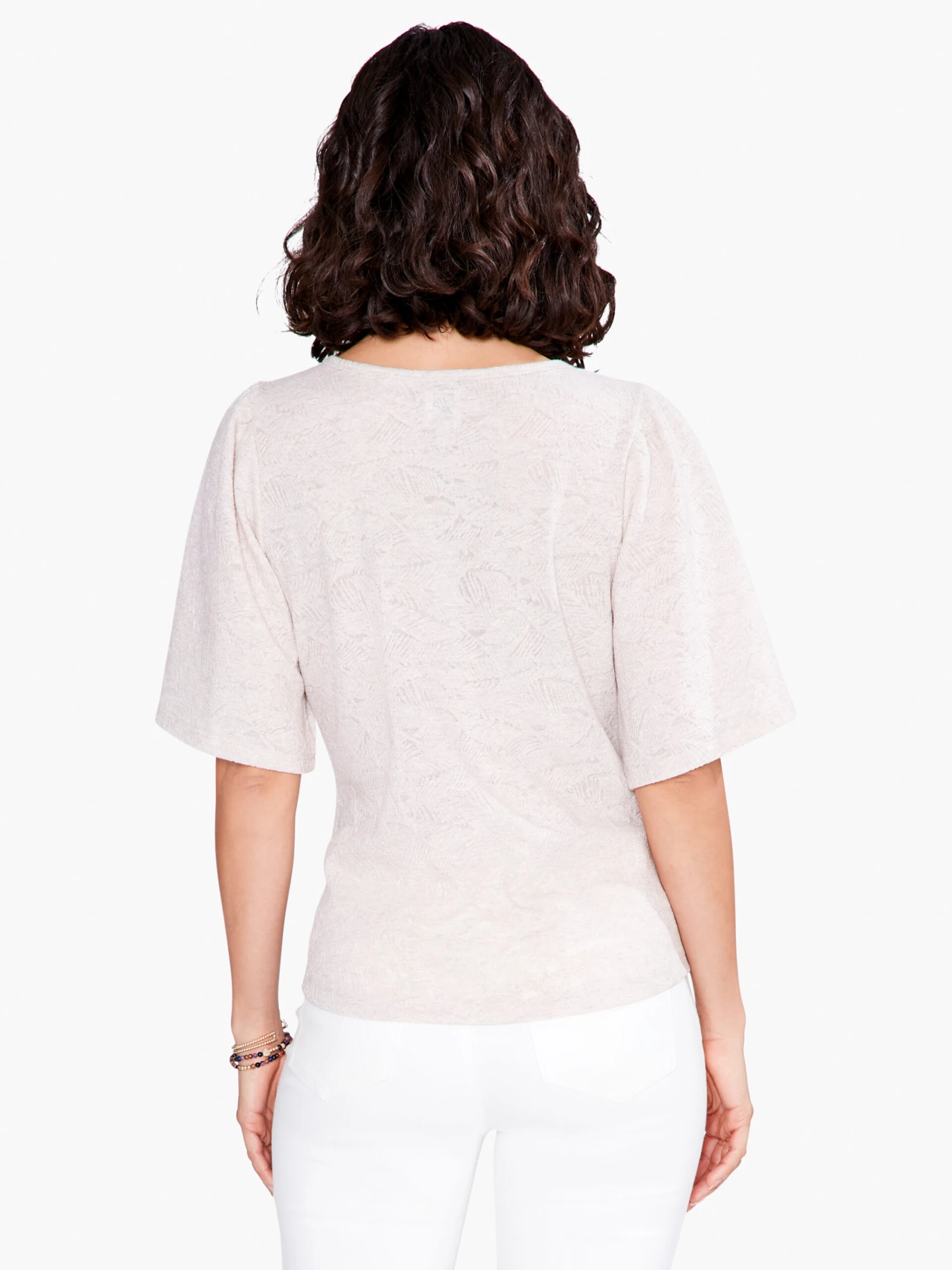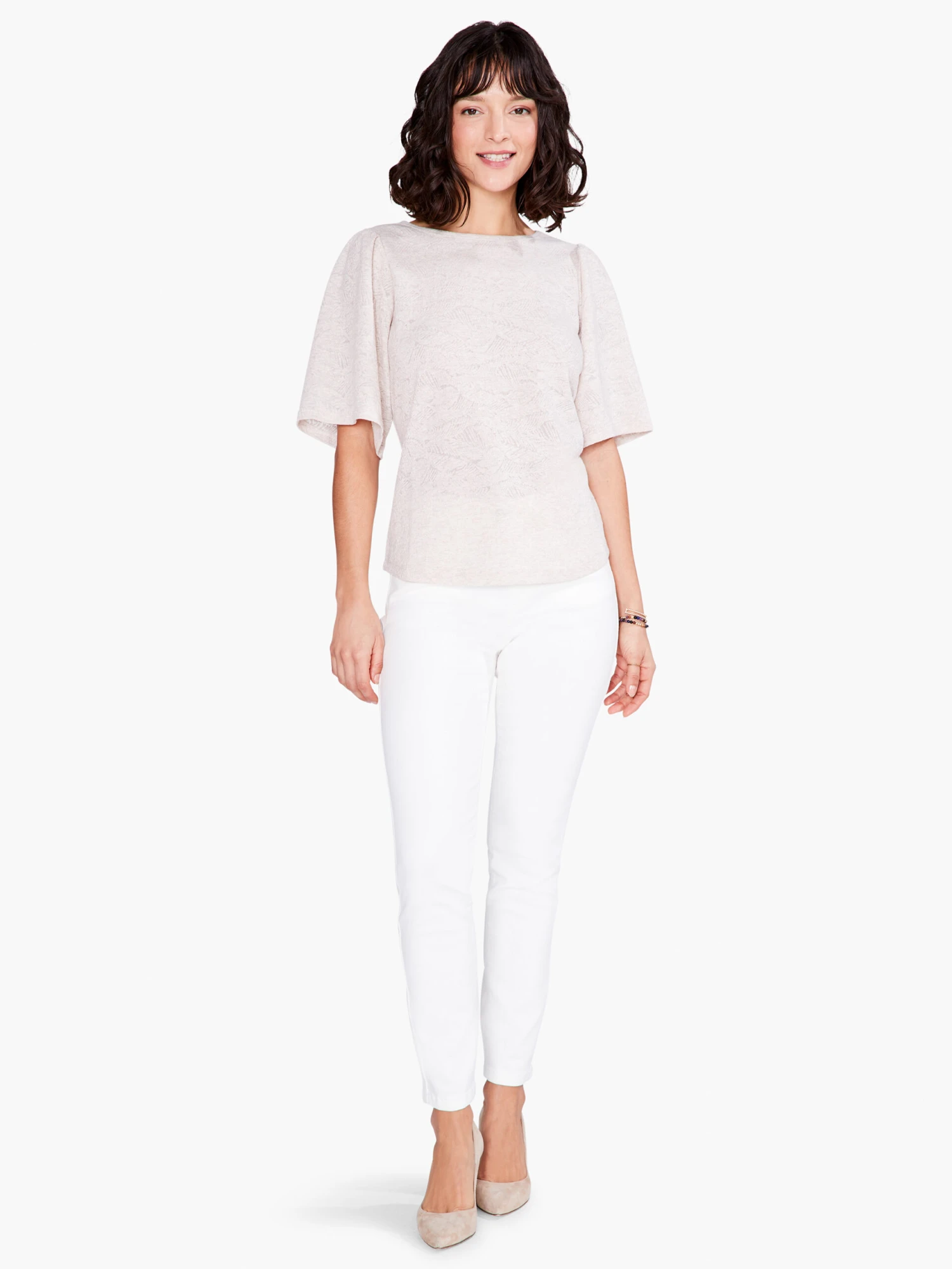A modern novelty lace top in tasteful off white is an easy way to add elegance and depth to your next look, even when the look is as simple as adding your favorite pair of jeans. The wide bateau neck and elbow length flutter sleeves add shape to the elevated texture. Designed to sit at the hip.