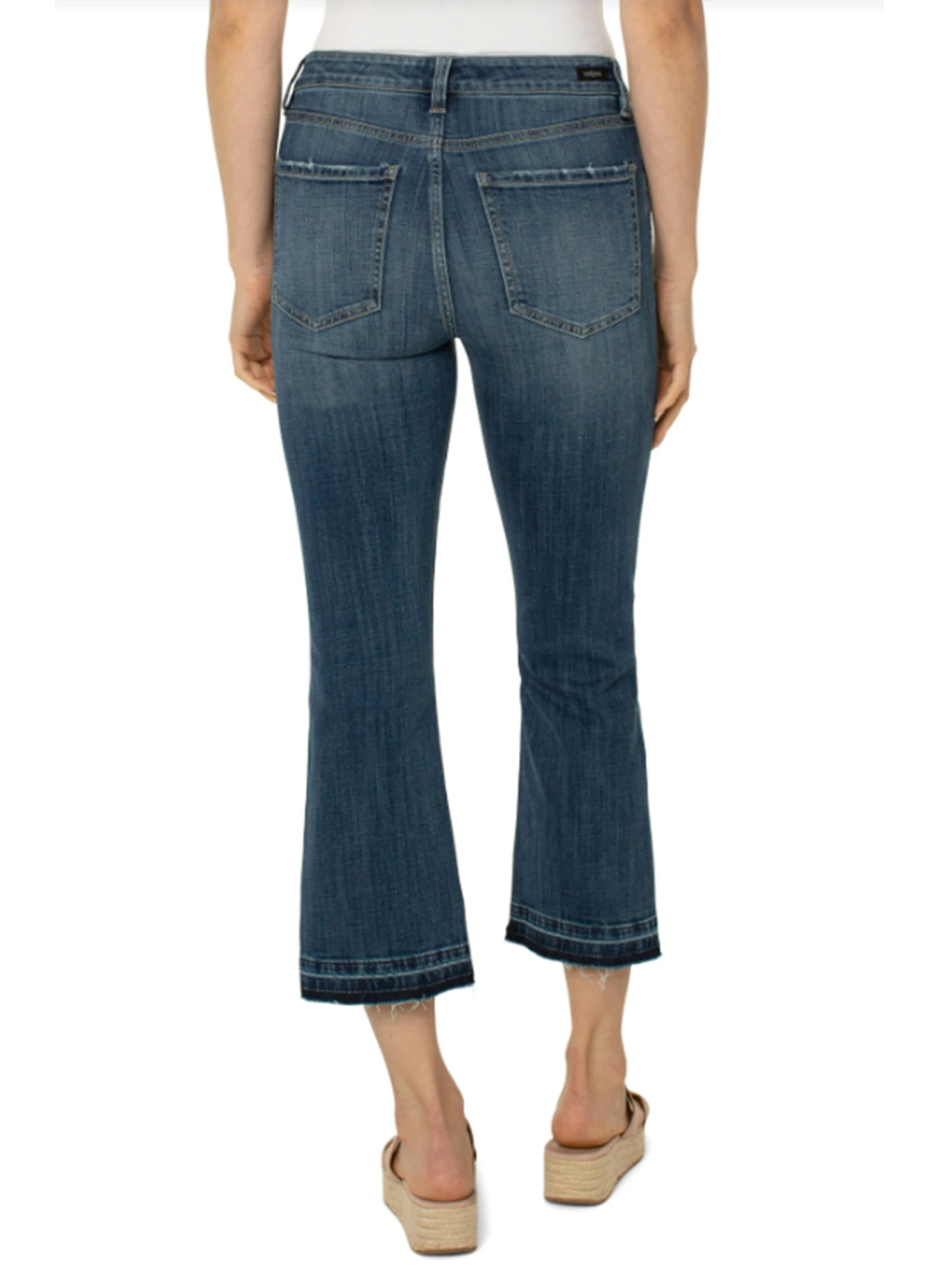 Mid rise flare crop in super soft, lofty denim. Flare leg with raw cut and released hem detailing. Seaming detail along sides adds unique aesthetic.