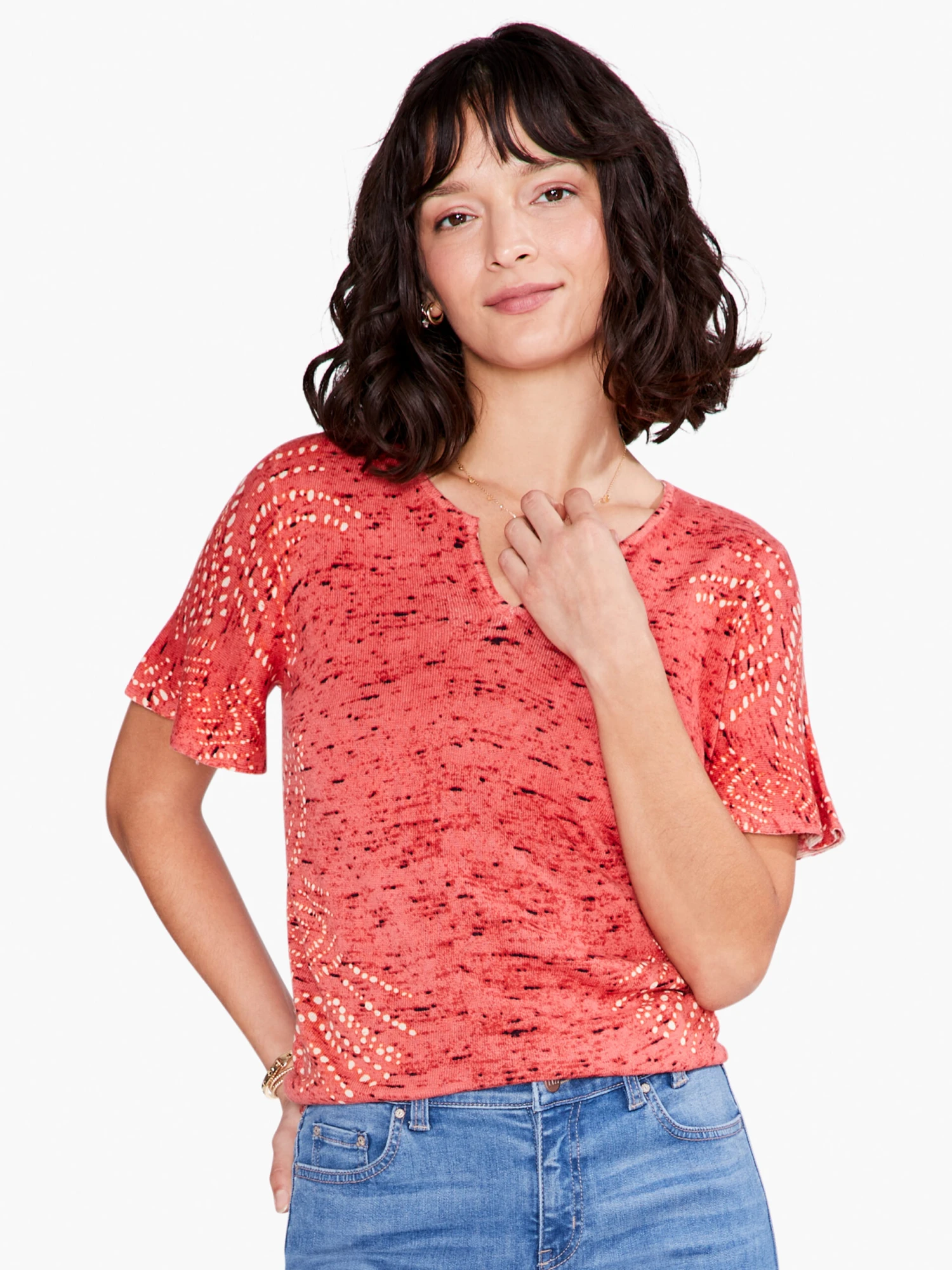 Don’t let the ‘sweater’ label fool you, this fun warm weather print is meant to be worn when the sun is shining. Comfortable always thanks to its breathable and modern linen blend that has a little bit of stretch. An easy pullover with flutter sleeve details and a split neck. Designed to sit at the hip.