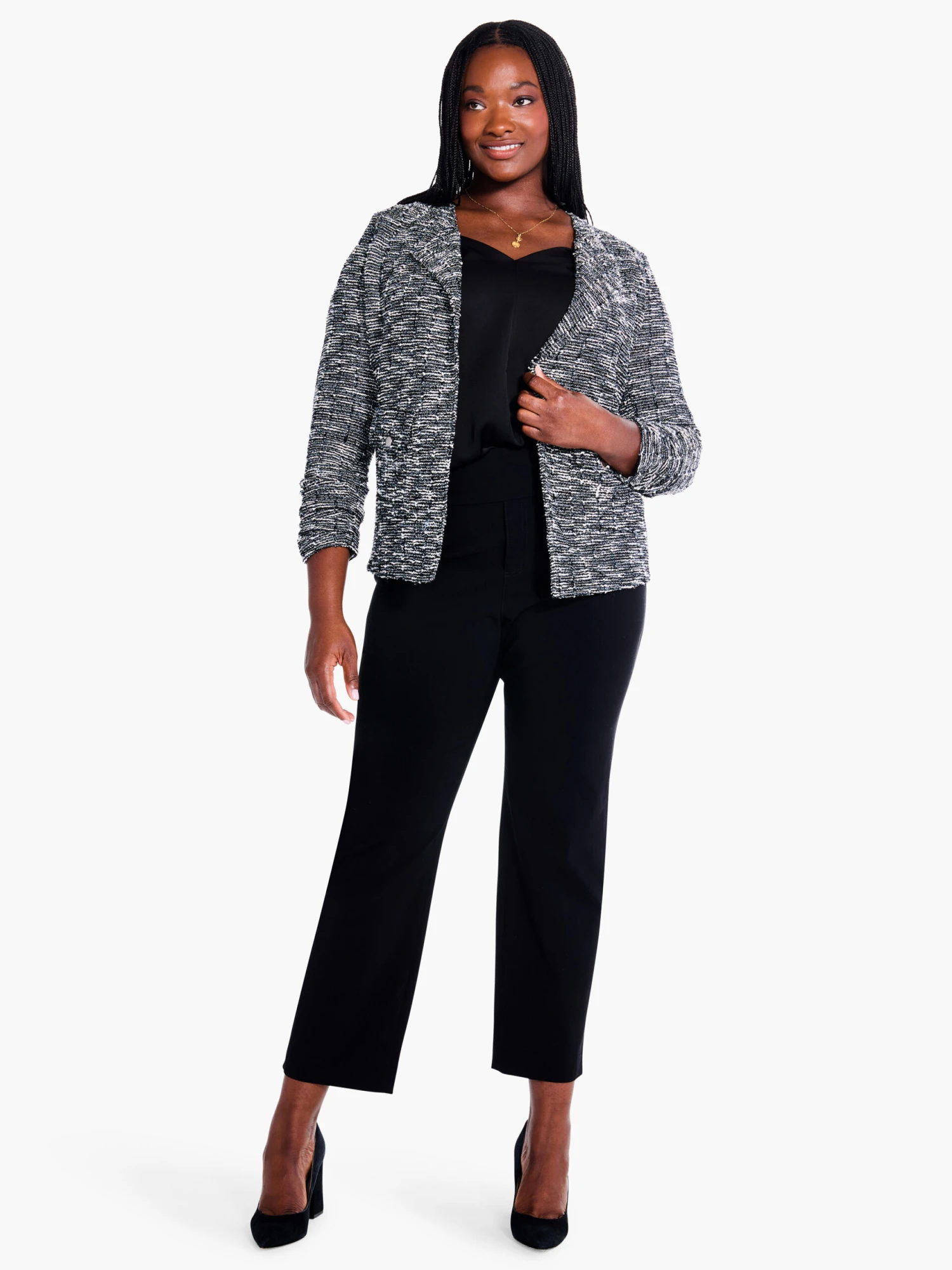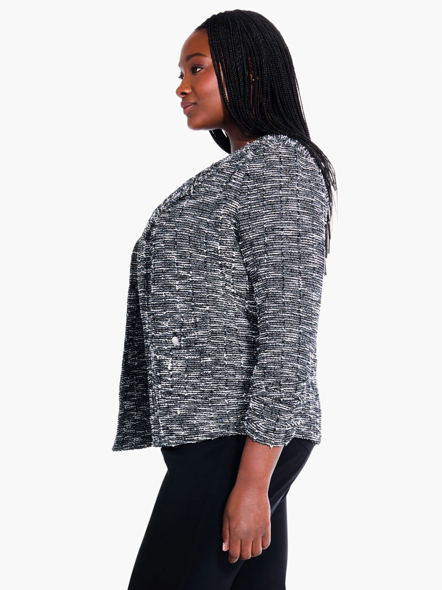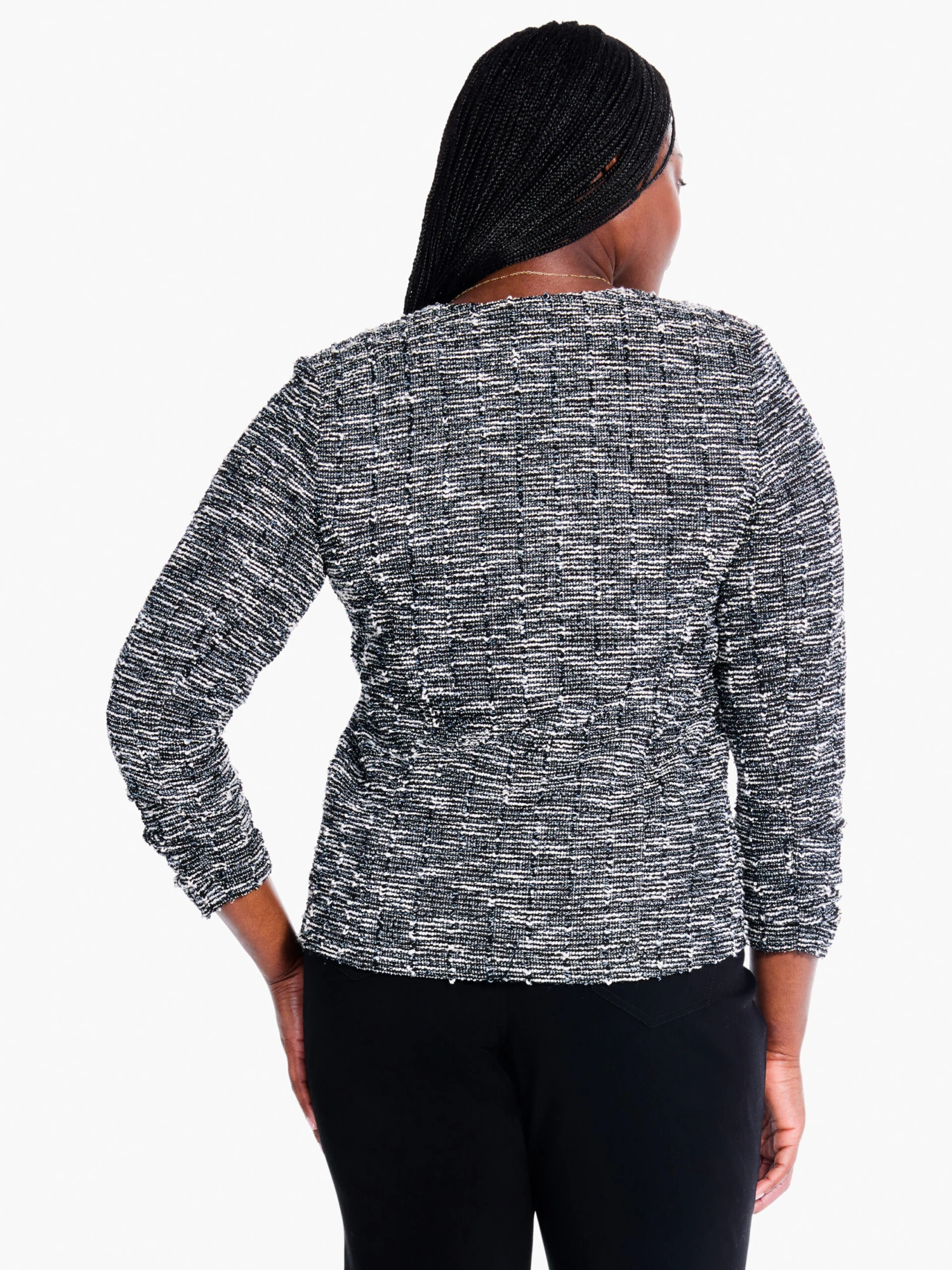 Light up the night, and anytime, with this super stretchy, super stylish layer. Tiny threads of metallic threads in the weave of this fashion jacket add some night sky shine and sophistication. Starry Sky is unlined and features textured scrunch sleeves, an easy a hook and eye closure, patch pockets, and a hem that sits at the hip. Perfect for layering!