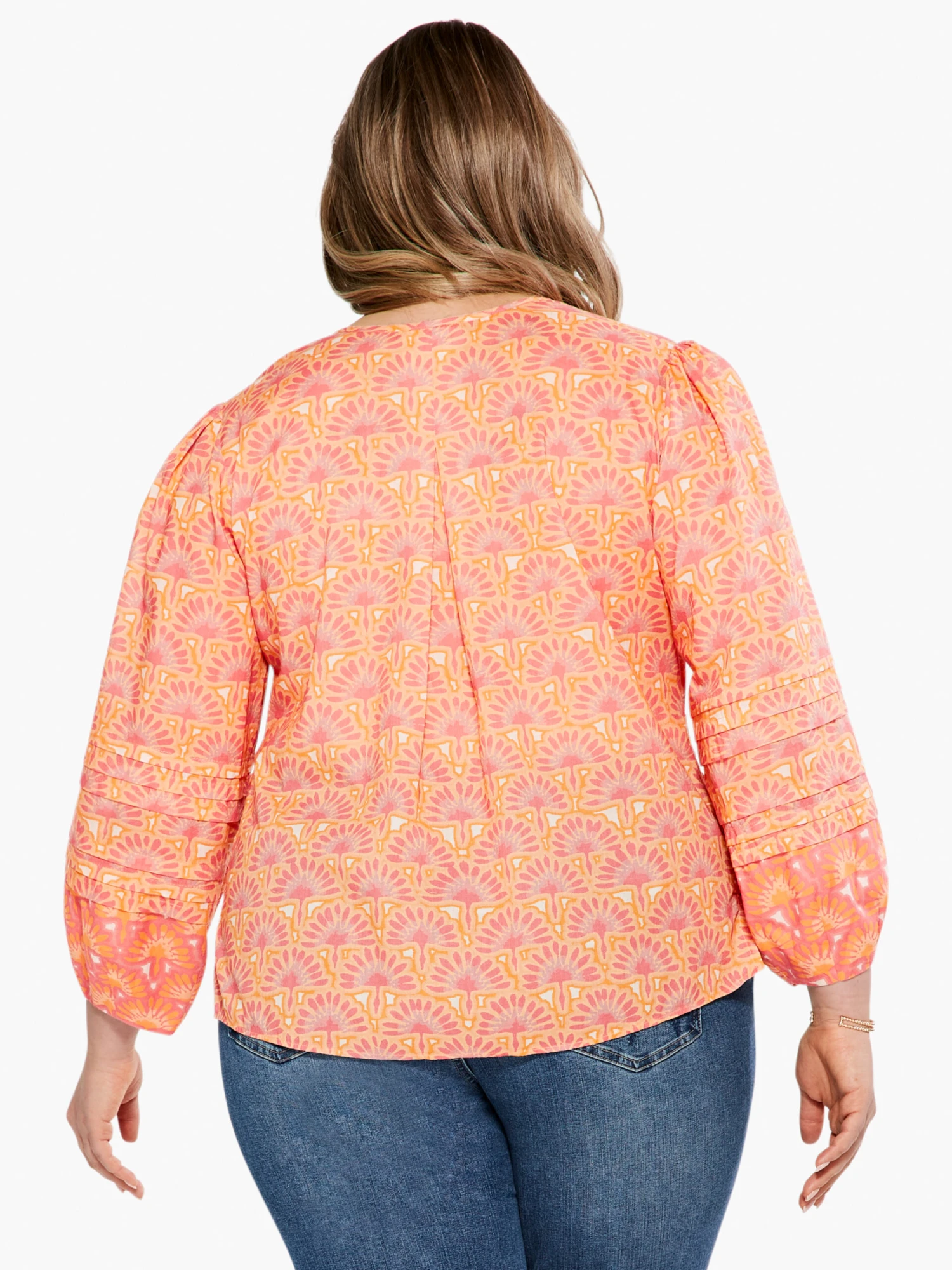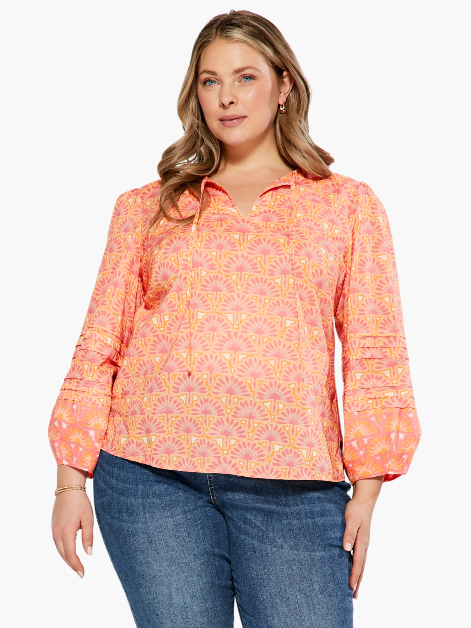 A festively fun print we designed in house on a totally new silhouette for us, this shirt takes your next casual look in an all new direction. Tie the front to make a keyhole opening or leave it open. With bracelet cuffs and flowy bishop sleeves. Sits just below the waist in an easy fitting silhouette. Made from 100% cotton.